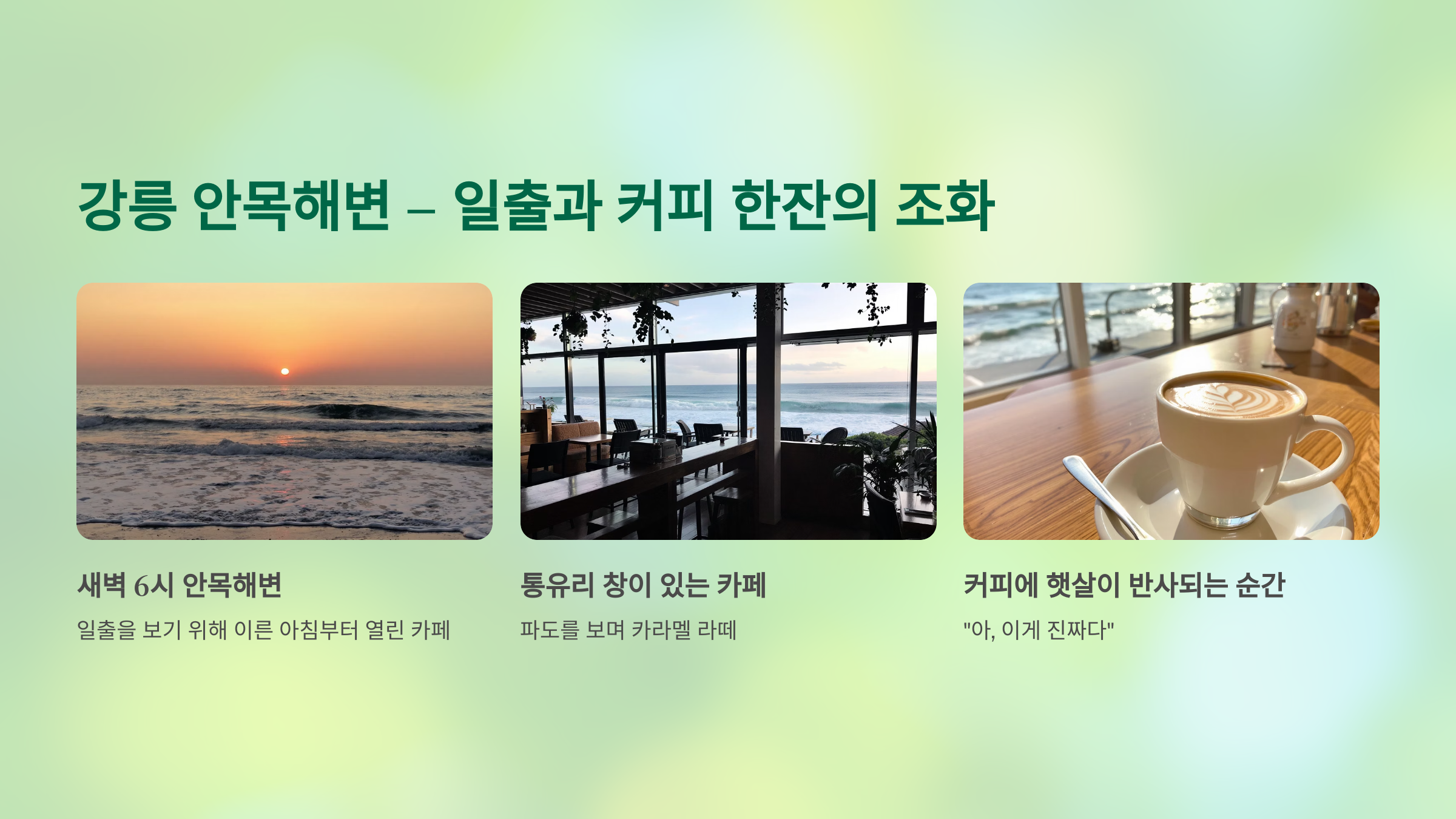 강릉에서 새벽 6시에 일어나 안목해변을 걸었어요. 대부분 문을 열지 않았지만, 몇몇 카페는 일출을 보기 위해 이른 아침부터 열더라고요. 통유리 창이 있는 카페에 들어가서, 파도를 보며 카라멜 라떼를 마셨죠. 커피에 햇살이 반사되던 순간, 속으로 생각했어요. "아, 이게 진짜다."