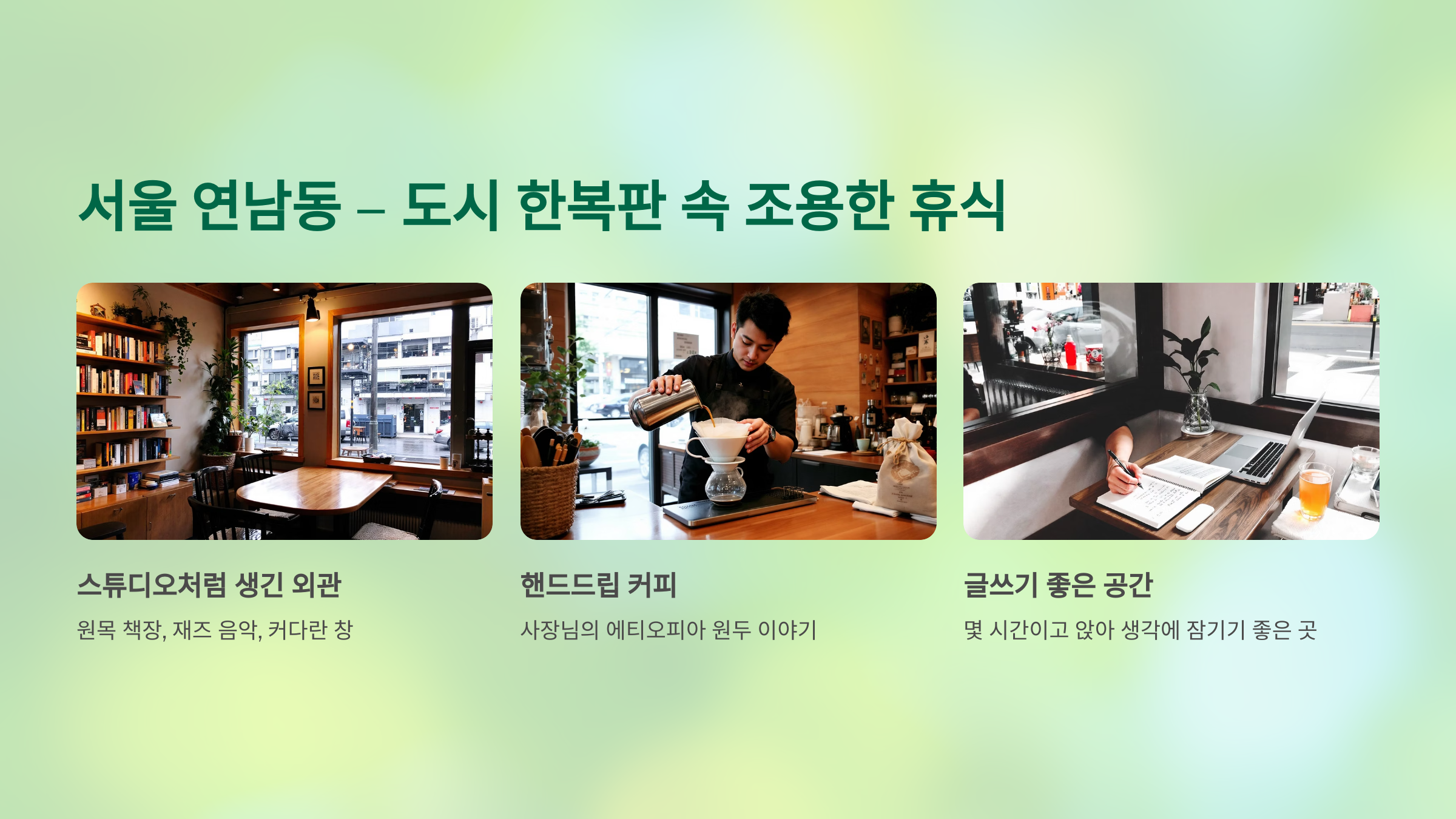 어느 주말, 아무 계획 없이 연남동을 걷다가 우연히 작은 카페를 발견했어요. 스튜디오처럼 생긴 외관, 원목 책장, 재즈 음악, 그리고 커다란 창 하나. 핸드드립 커피는 평범했지만 사장님이 에티오피아 원두에 대해 얘기해 주셔서 더욱 특별했죠. 몇 시간이고 앉아 글을 쓰고 생각에 잠기기에 참 좋은 공간이었어요.