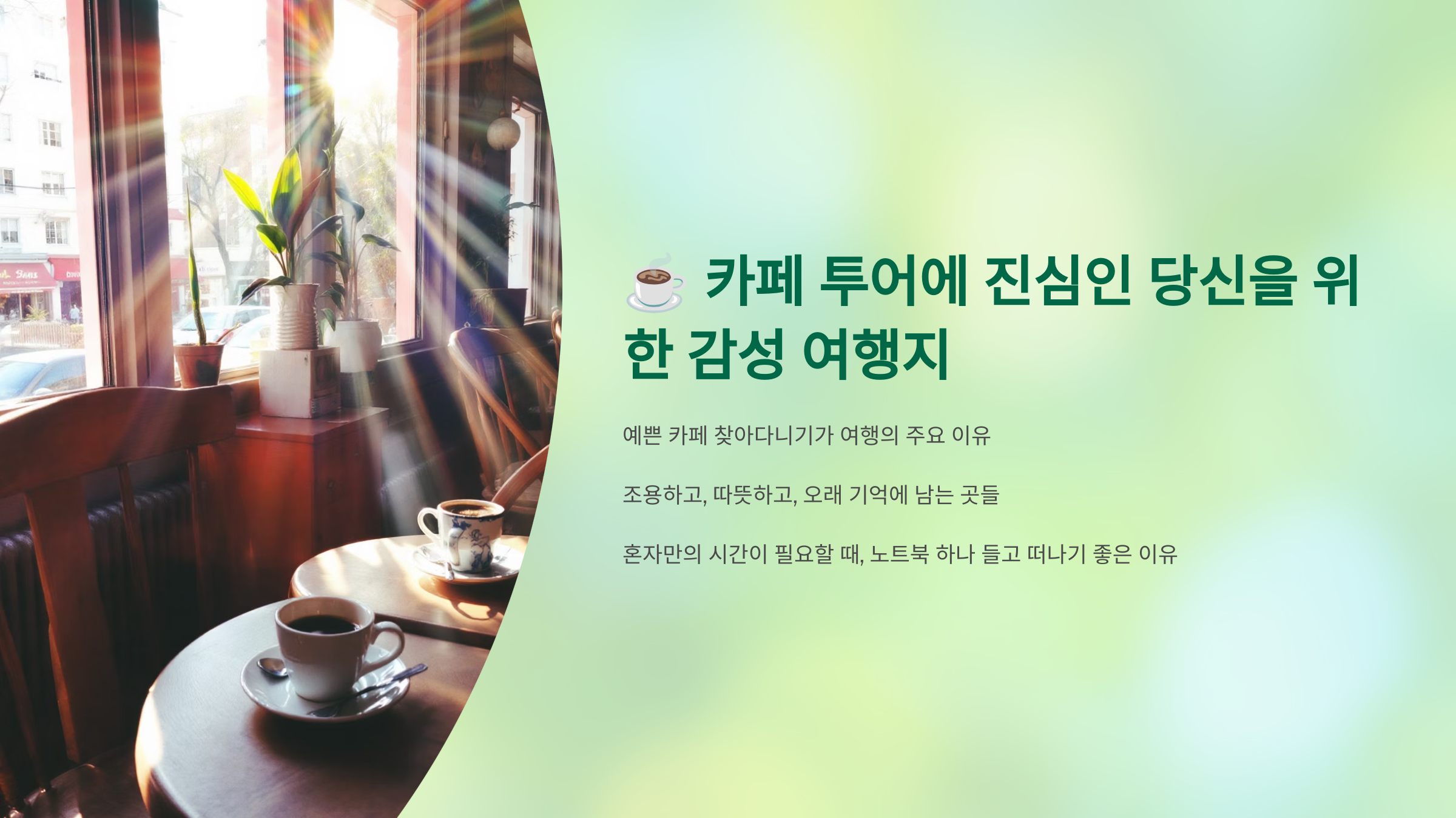 지난 몇 년간 저는 ‘예쁜 카페 찾아다니기’가 여행의 주요 이유가 되어버렸어요. 사람들이 줄 서는 유명 카페보다는, 조용하고, 따뜻하고, 오래 기억에 남는 그런 곳들을 좋아해요. 햇살이 예쁘게 들어오는 창가, 막 볶은 원두 향기, 그리고 잔잔하게 흐르는 음악. 혼자만의 시간이 필요할 때, 노트북 하나 들고 떠나기 가장 좋은 이유가 바로 ‘카페’입니다.