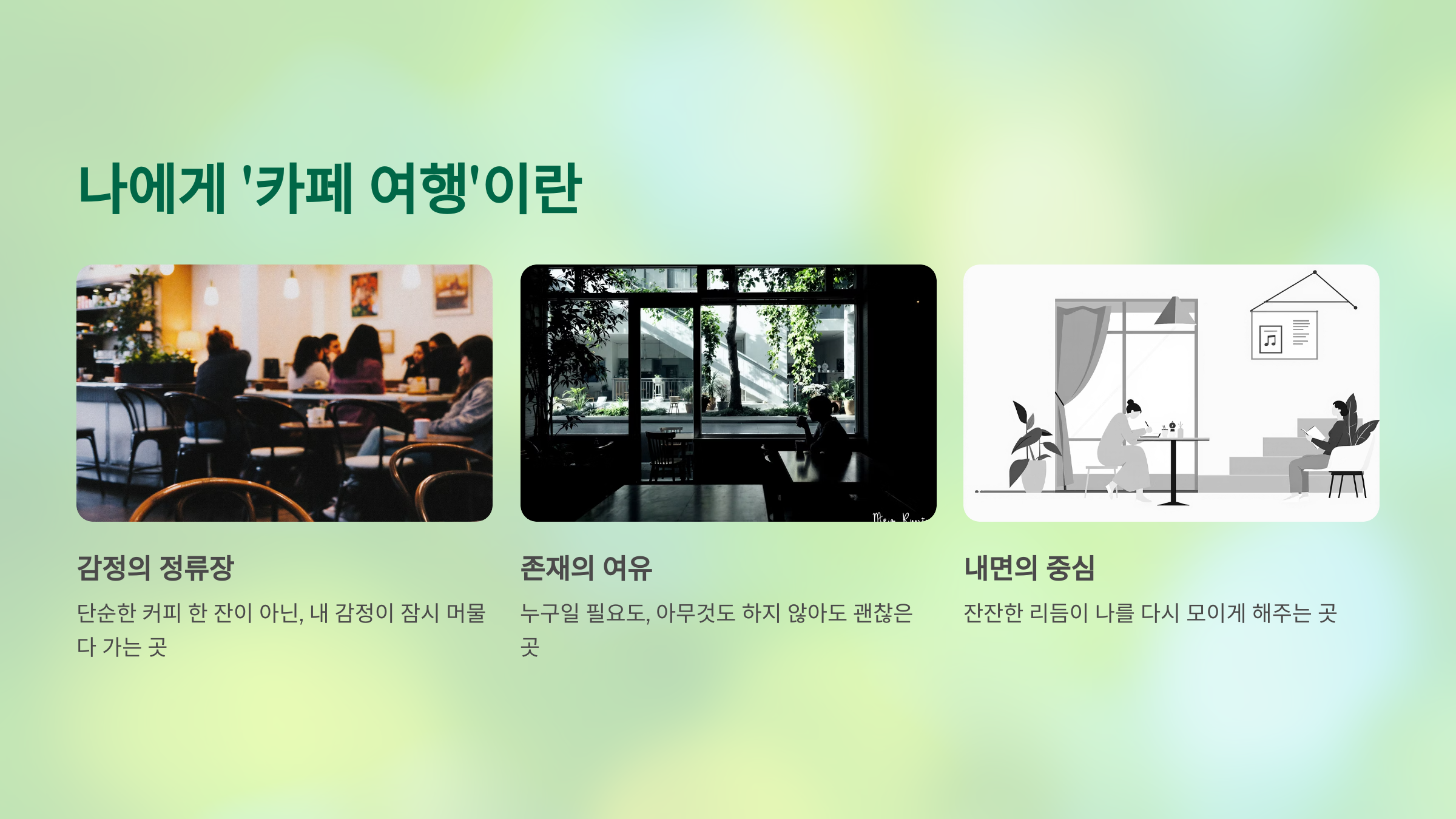저에게 카페는 단순한 커피 한 잔이 아니에요. 감정이 잠시 쉬어가는 ‘정류장’ 같아요. 좋은 카페에서는 누구일 필요도 없고, 아무것도 하지 않아도 괜찮아요. 숨 쉬고, 마시고, 바라보는 것만으로 충분하죠. 그 잔잔한 리듬이 저를 중심으로 다시 모이게 해줘요.
