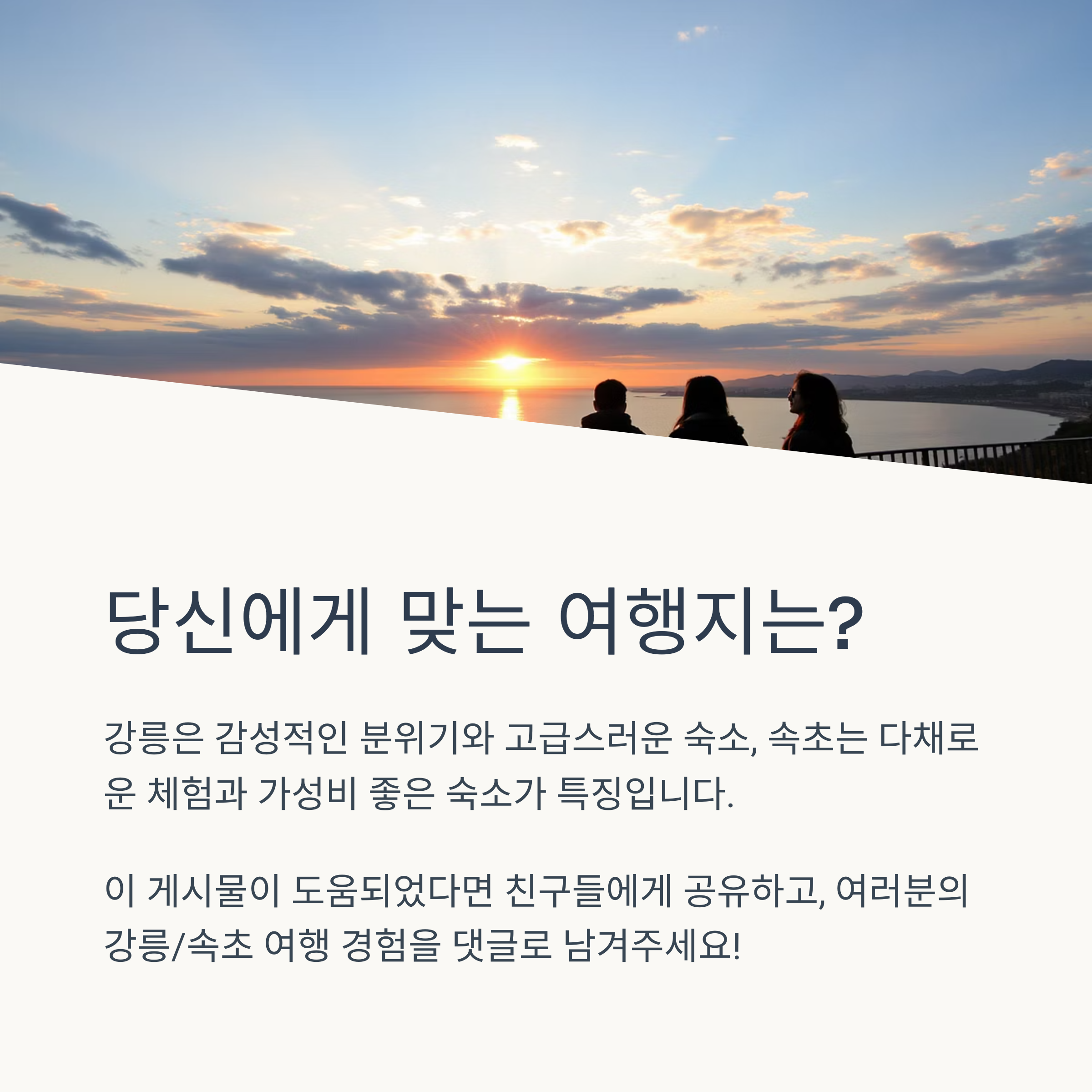 강릉과 속초는 비슷하면서도 각기 다른 매력을 지닌 동해안의 대표 관광지입니다. 강릉은 감성적인 분위기와 고급스러운 숙소, 조용한 여행을 선호하는 사람들에게 적합하며, 속초는 다채로운 체험, 가성비 좋은 숙소, 가족 단위 여행객들에게 잘 맞습니다. 여행 목적과 스타일에 따라 선택하면 더 만족스러운 여행이 될 수 있습니다. 지금 바로 강릉 또는 속초로 힐링 여행을 계획해 보세요!