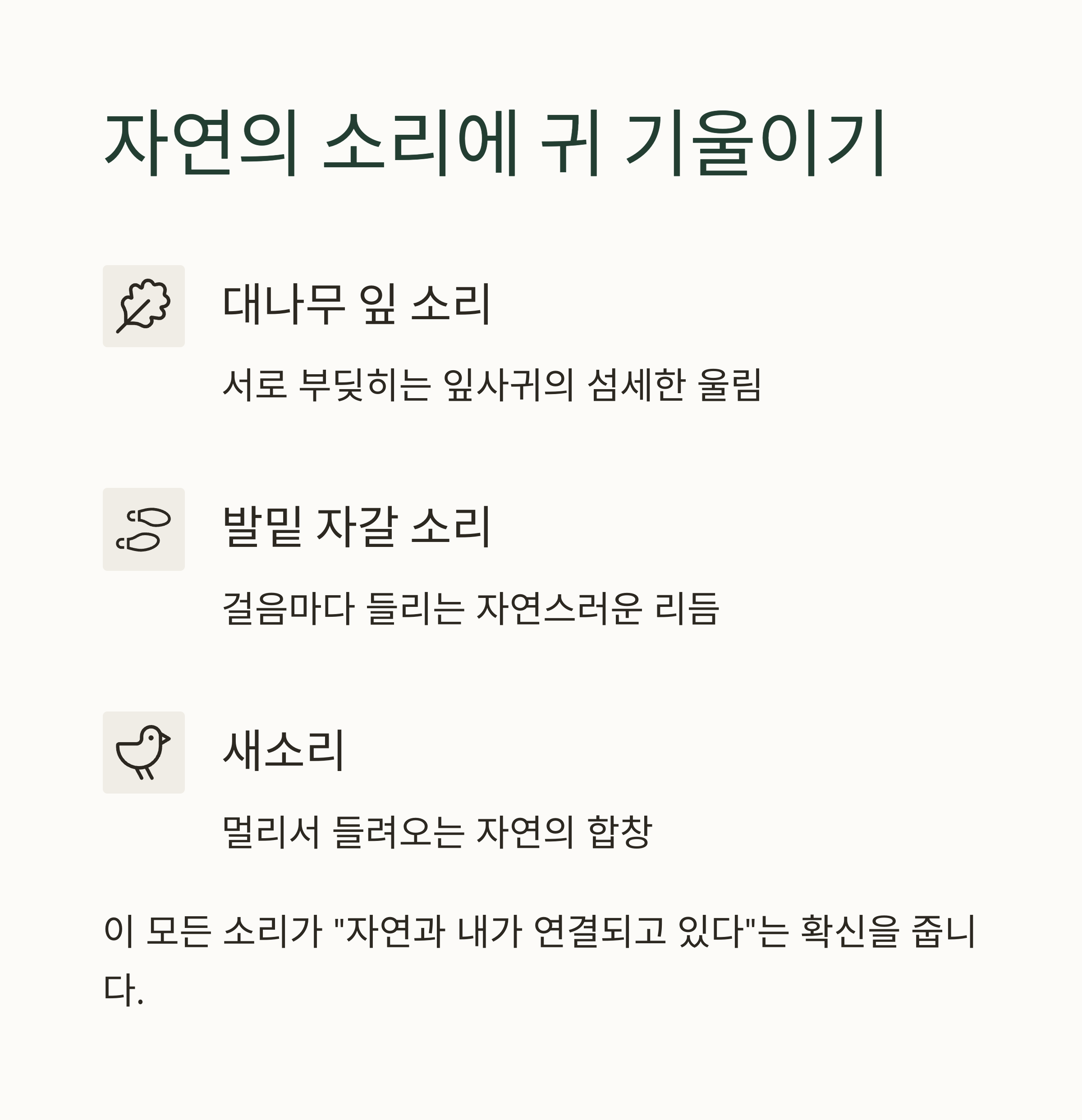 멀리서 들려오는 새소리가 온몸을 감싸듯 스며듭니다.