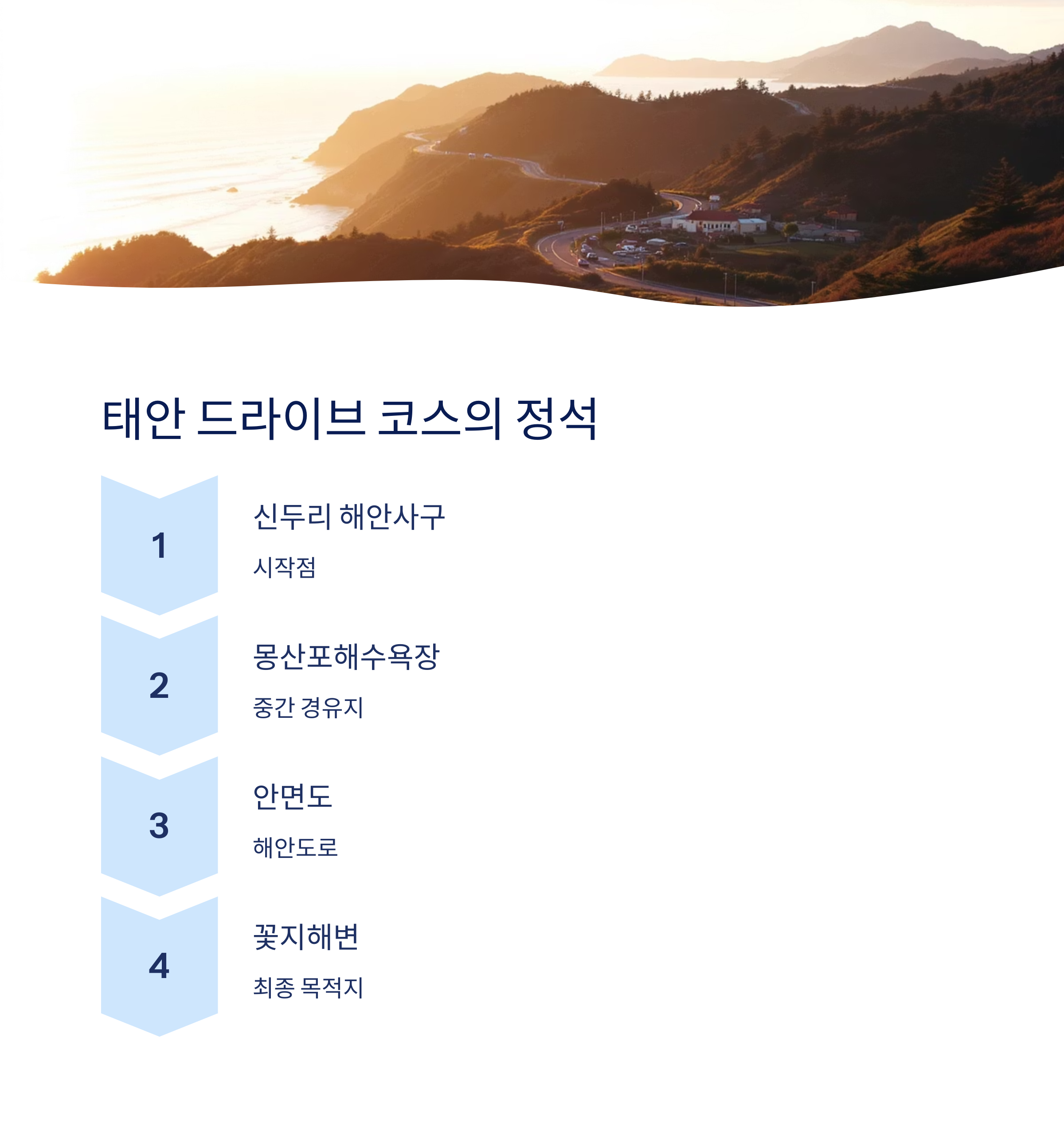 서해안 드라이브 중에서도 ‘태안 루트’는 자연과 감성을 동시에 만족시킬 수 있는 최적의 코스입니다. 서울이나 수도권에서 출발할 경우 서해안고속도로를 따라 약 2시간 반~3시간 정도 소요되며, 도착 후 본격적인 해안 드라이브를 시작할 수 있습니다. 대표적인 루트는 태안읍에서 출발하여 신두리 해안사구 → 몽산포해수욕장 → 안면도 → 꽃지해변으로 이어지는 해안도로 코스입니다. 중간중간 전망이 탁 트인 구간이 많아 잠시 차를 멈추고 경치를 감상하거나 사진을 찍기에도 좋습니다. 특히 몽산포에서 안면도 진입 전후로 펼쳐지는 해안도로는 굽이굽이 이어지는 길 위로 소나무 숲과 바다가 번갈아 펼쳐지며, 드라이브의 즐거움을 극대화합니다. 길가에는 드라이브 인 카페, 지역 특산물 식당, 전통시장이 있어 차를 타고만 다니는 것이 아닌, 지역 문화를 오롯이 체험할 수 있는 기회도 많습니다. 또한 이 지역은 사계절 내내 각각의 매력을 지니고 있어 여름 해수욕, 가을 억새와 노을, 겨울의 고즈넉함 등 계절에 따라 다른 풍경을 즐길 수 있습니다. 드라이브의 목적이 단순한 이동이 아닌, ‘여행’ 그 자체일 경우 태안 루트는 탁월한 선택이 됩니다.