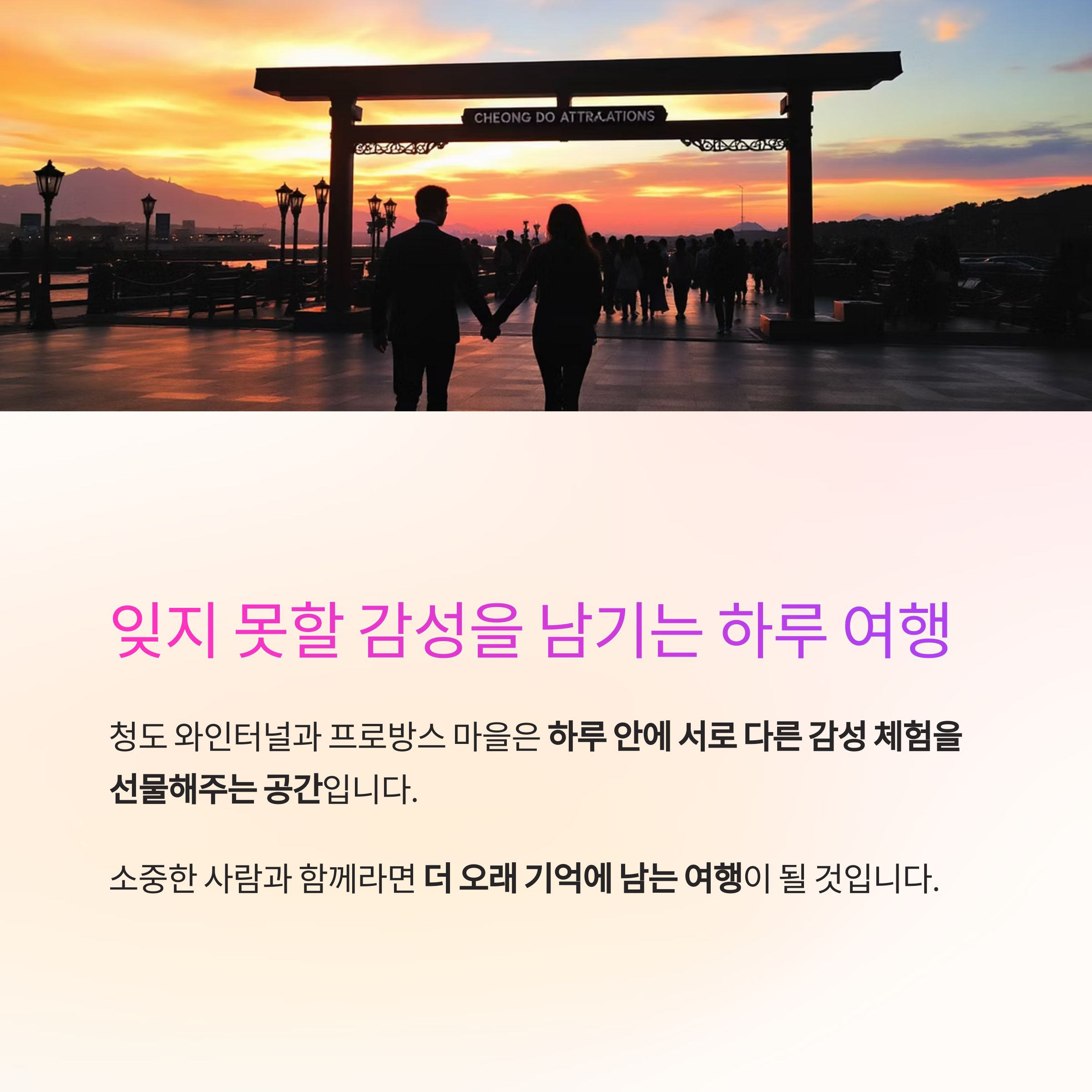 청도는 감성적인 여행지로 잘 알려져 있으며, 특히 와인터널과 프로방스 마을은 동화 속을 걷는 듯한 분위기로 많은 여행자들에게 사랑받고 있습니다. 와인터널에서는 오묘한 빛과 와인의 깊은 향을 느낄 수 있으며, 프로방스 마을에서는 알록달록한 건물들과 아기자기한 상점들이 여행의 감성을 더해줍니다. 이번 글에서는 청도의 두 핫플을 중심으로 감성 가득한 여행 코스를 소개합니다.