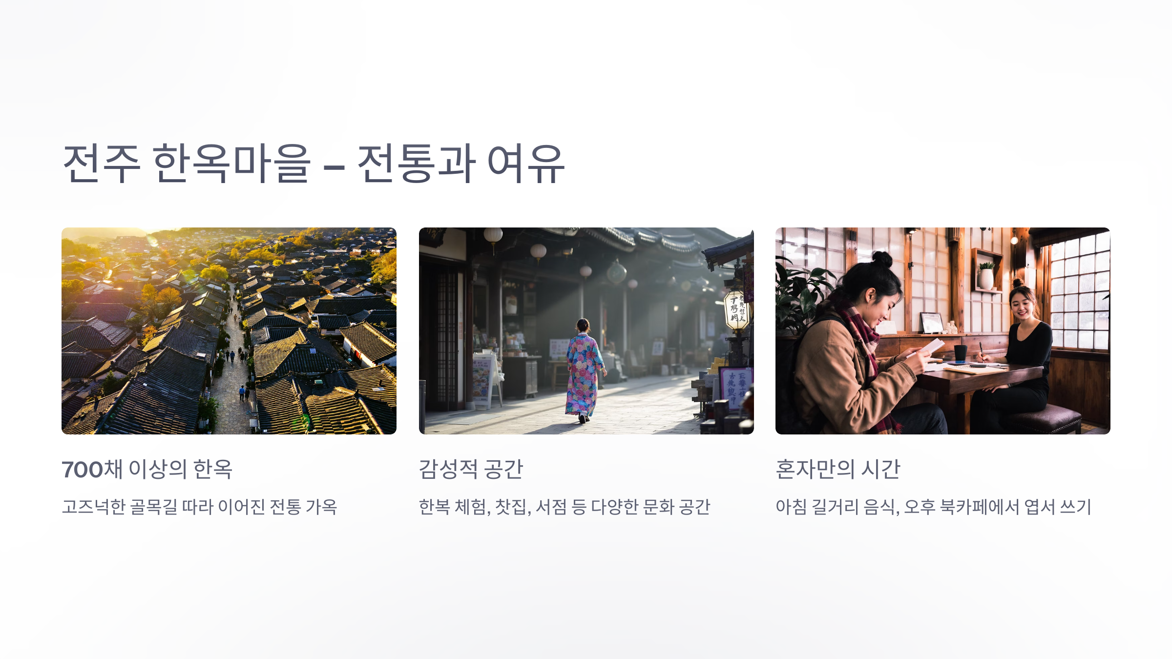 전주는 전통과 현대가 공존하는 아름다운 도시입니다. 전주 한옥마을에는 700채 이상의 한옥이 고즈넉한 골목길을 따라 이어져 있으며, 한복 체험, 찻집, 서점 등 감성적인 공간들이 가득합니다. 아침엔 길거리 음식으로 하루를 시작하고, 오후엔 조용한 북카페에서 엽서를 쓰며 혼자만의 시간을 보내기에 제격입니다.