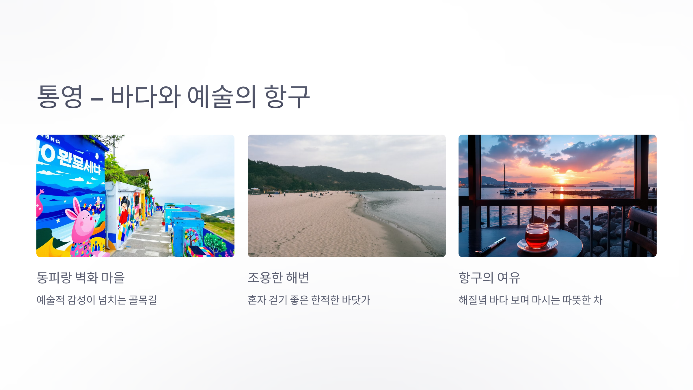 남해안에 위치한 통영은 많이 알려져 있지않은 보석 같은 도시입니다. 동피랑 벽화 마을, 조용한 해변, 바다 내음이 가득한 시장은 혼자 걷기에 안성맞춤입니다. 해질녘 항구를 바라보며 마시는 따뜻한 차 한잔은 깊은 휴식과 사색의 시간이 되어줍니다.