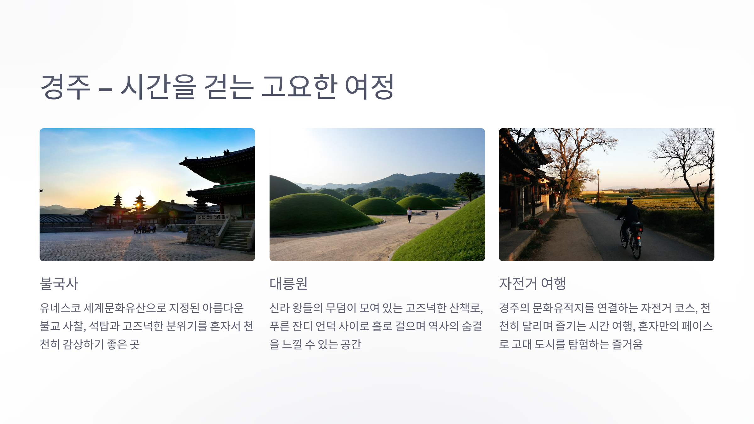 역사와 전통을 좋아한다면 경주는 혼자 여행하기 좋은 최고의 도시입니다. 신라의 천년 수도였던 이곳은 불국사, 석굴암, 대릉원 등의 유네스코 세계문화유산이 가득합니다. 자전거를 타고 왕릉과 연못, 석탑을 따라 천천히 달리다 보면 마치 시간 여행을 하는 듯한 기분이 듭니다.